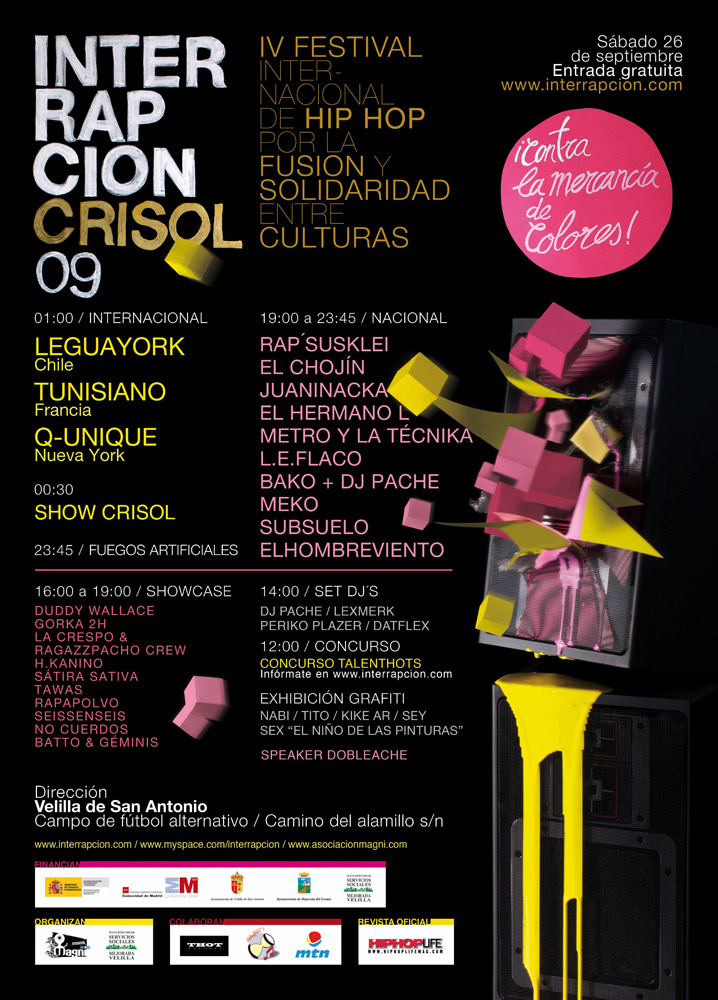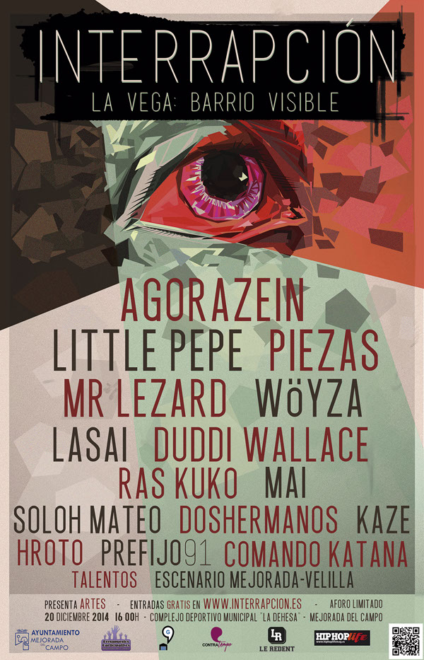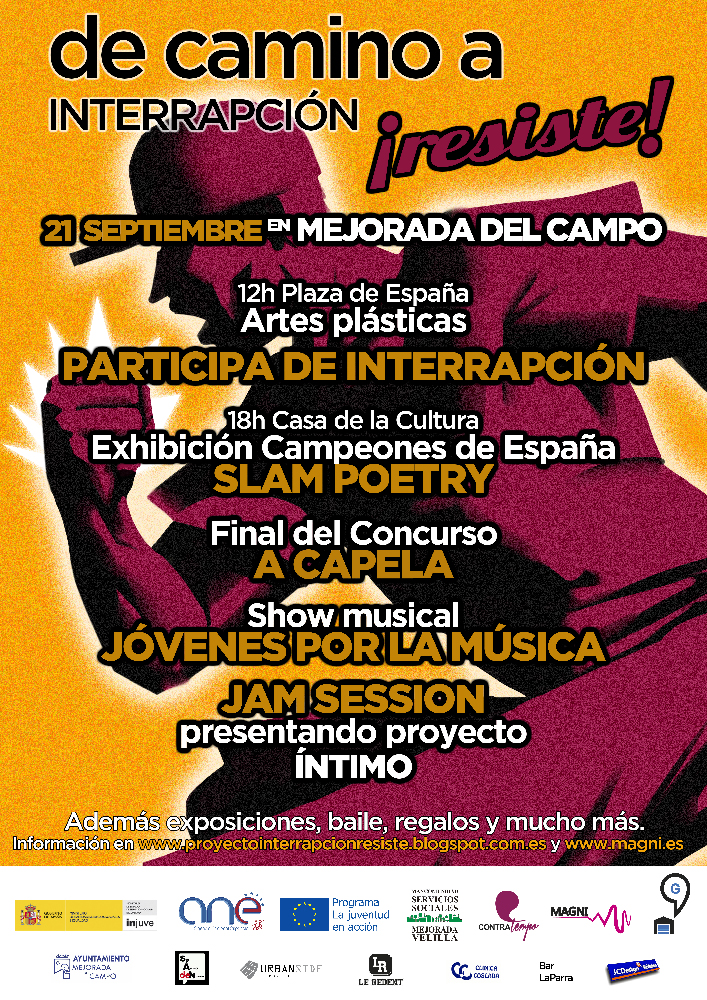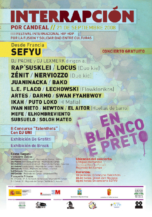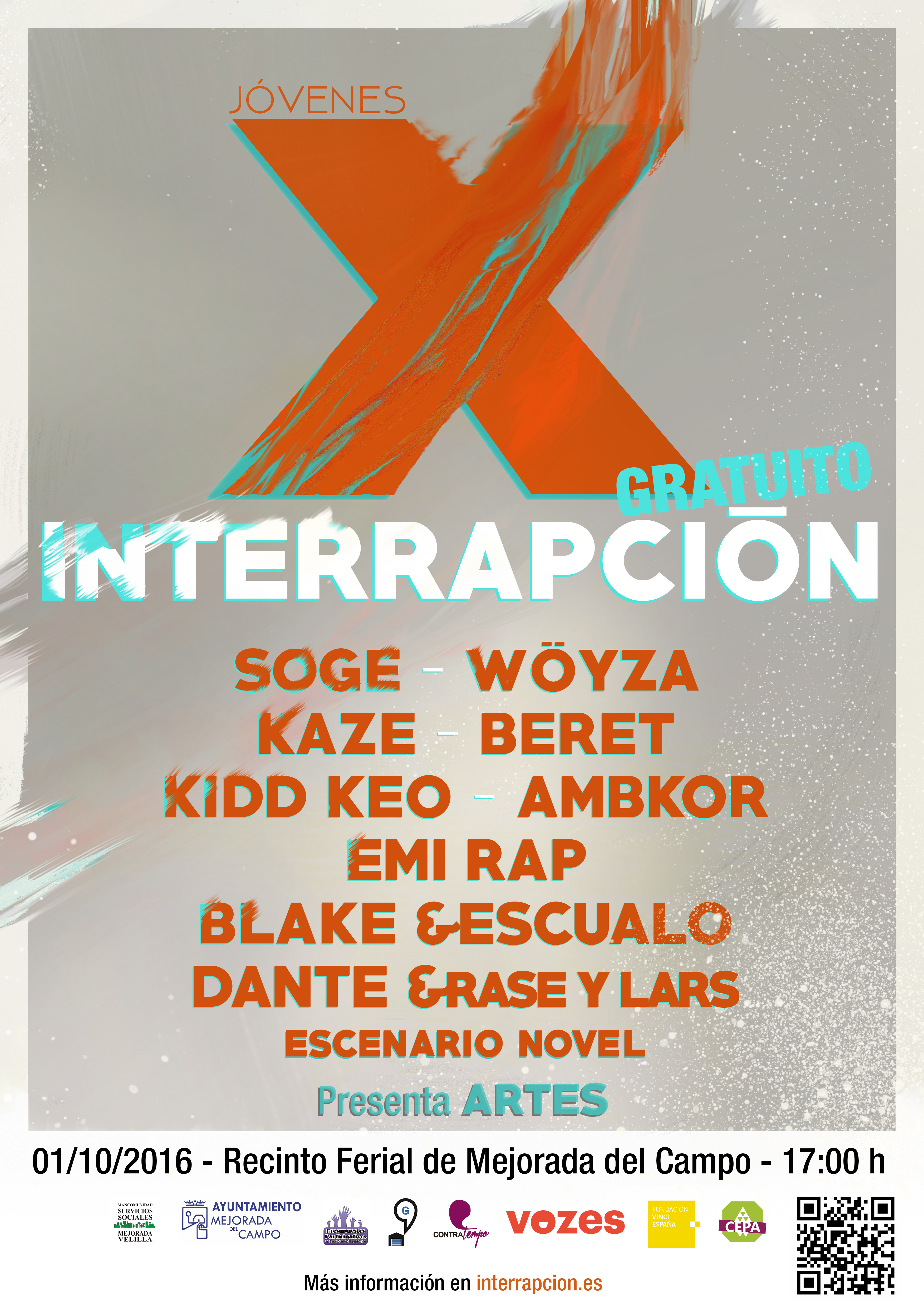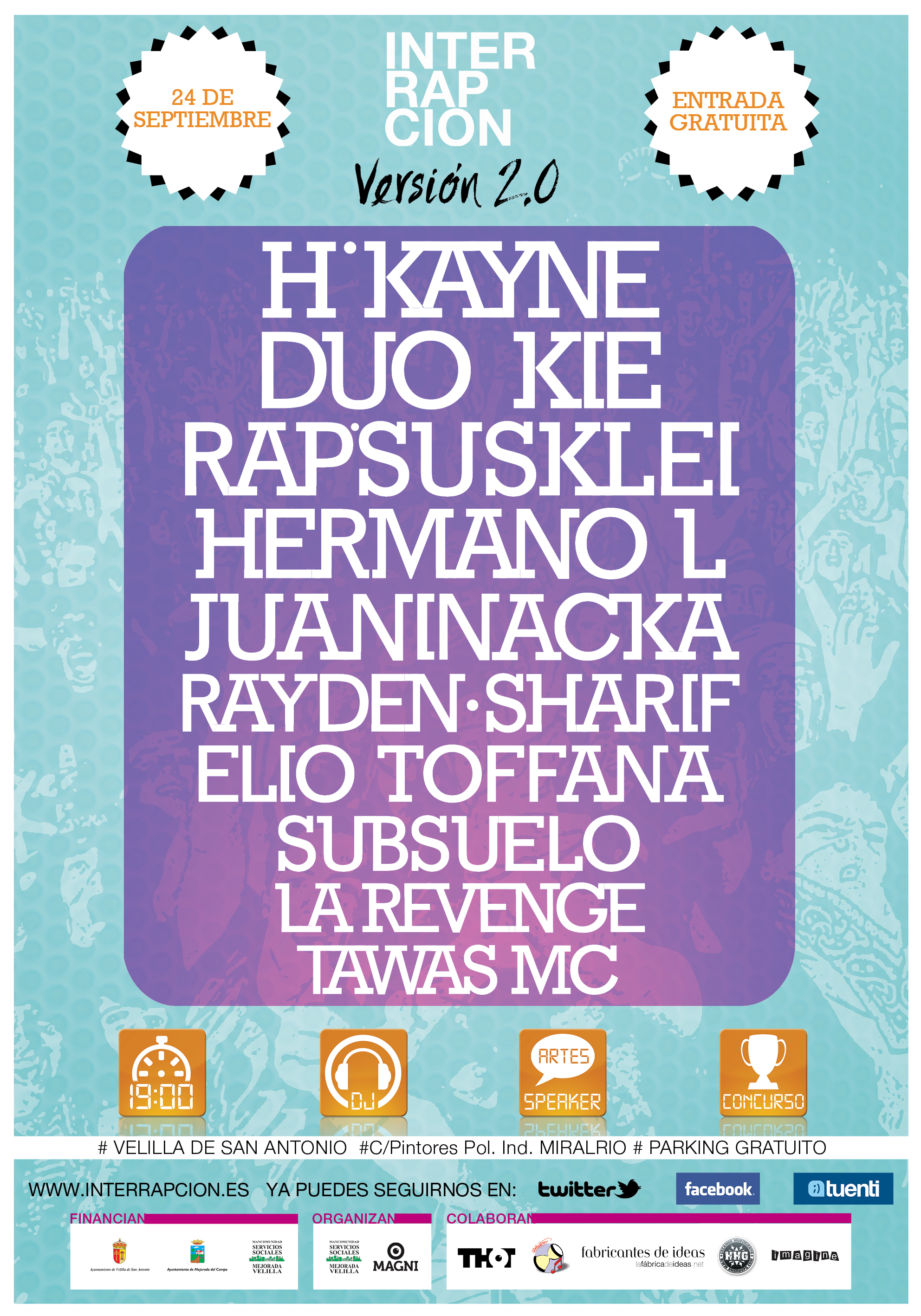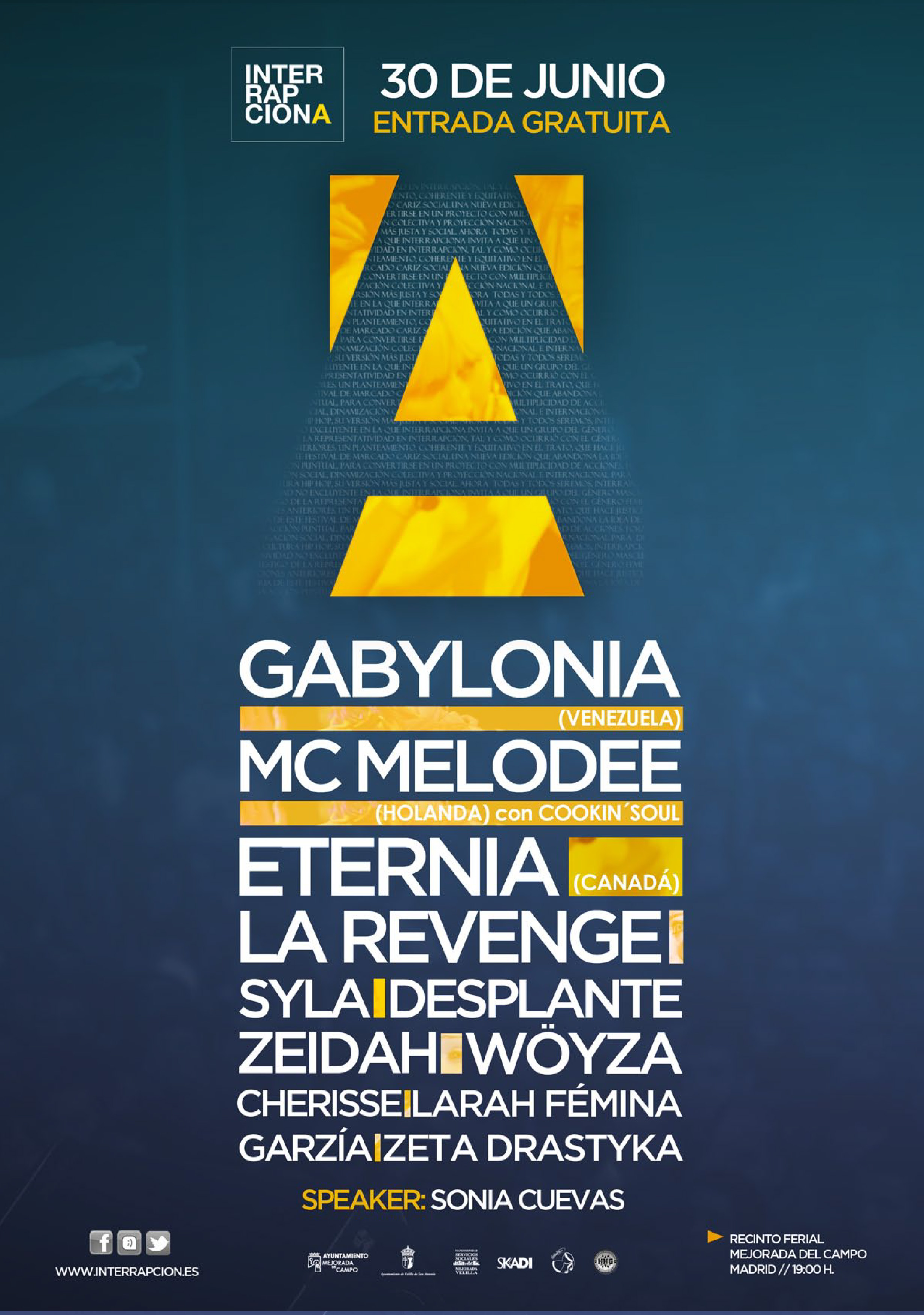 INTERRAPCION es un festival internacional de música gratuito y con vocación de servicio público, que nace en 2006 con el ánimo de reivindicar la justicia y la transformación social a través de la cultura Hip Hop. Con once ediciones en su haber y más de 25.000 espectadores. En esta nueva edición será una colaboración entre Asociación Garaje y la Concejalía de Juventud del Ayuntamiento de Moralzarzal (Madrid).